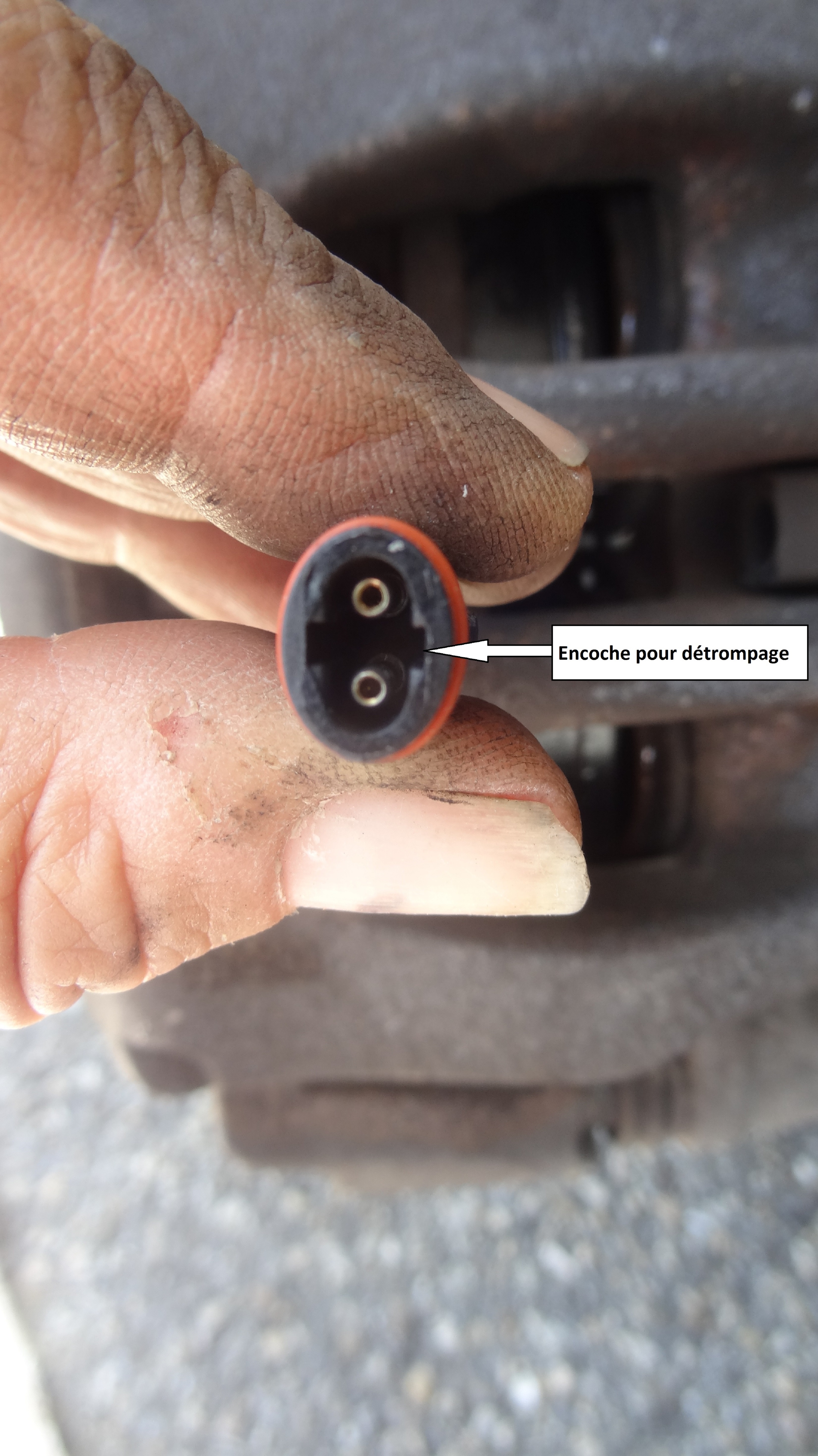 Seconde et dernière étape de la mise en place du témoin d’usure neuf : Enfichage du connecteur. Celui-ci étant ovale et afin de bien le positionner, aucun problème car des détrompeurs sont présents (aucune importance pour le sens). Je précise quand même qu’il est nécessaire de pousser asser fortement sur ce connecteur.