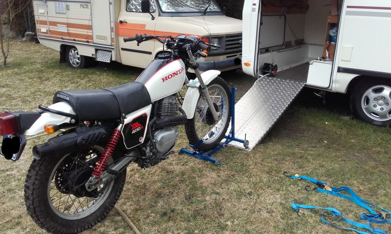 Le treuil est un treuil de recup que j'ai légèrement modifié , j'ai mis une feuille d'alu 3 mm dans le fond de la soute afin de repartir le poids de la moto le plan incliné est en tôle alu de 3 aussi. Le chariot a basculeur a été fait par mes soins mais je l'ai fait d'après des photos sur le net .Il permet aussi de comprimer la fourche avec 2 sangles afin de passer le seuil (la 400 ne passe pas sans comprimer). Une fois dedans 4 sangles sont installées a demeure afin de brider la moto .Ca ne bouge absolument pas en roulant.